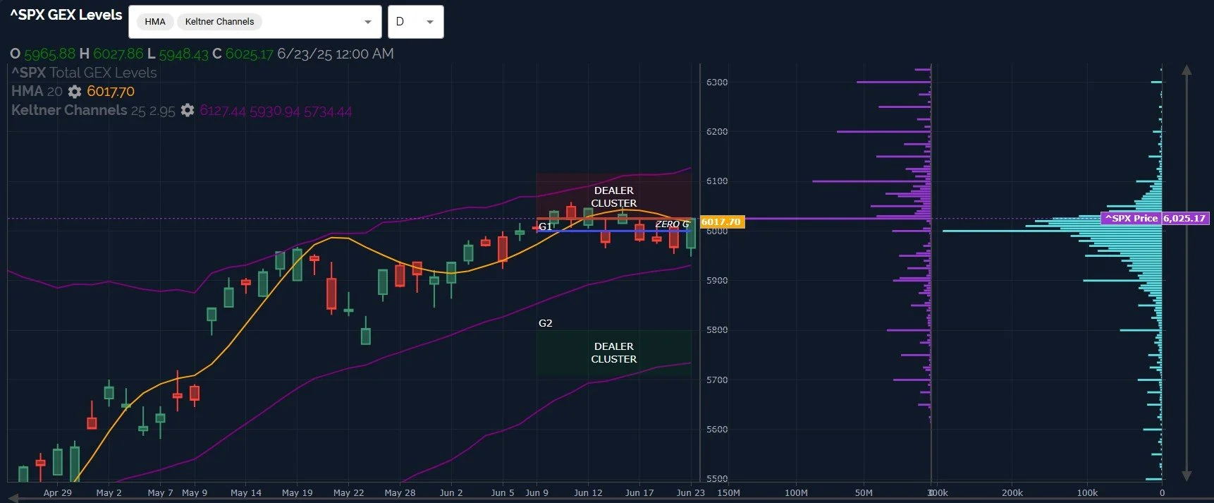 While SPX and QQQ have their own conflicting data points, SPX has internal conflict as well, seeing a sizable drop in positive GEX today after reaching 1B Friday. The drop to 697 million net positive GEX is still significant, but technically neutral from our view. The 3D graph still shows 5905 expiring 6/30 as the largest single GEX cluster other than today’s 0 DTE GEX at 6025, so keep that in mind. If we do end up tagging 6100 first, a drop of 200 points is actually a fairly modest pullback, so just be ready for anything if we don’t immediately fail and hold below the Hull tomorrow.