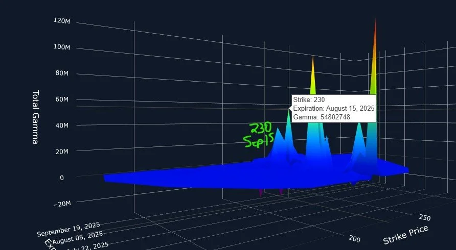 Our 3D graph shows most of the 230 GEX clusters at the August and September expirations, so we have at least some suggestion that a period of weakness is possible between now and mid-August, at least judging by a lack of individual large GEX clusters and higher strikes between now and then. Given the location of the lower Dealer Cluster zone and the lower Keltner channel, I think a drop to 210 is realistic before a final push toward 230. Let’s see how the next few days unfold and we’ll update our views accordingly.