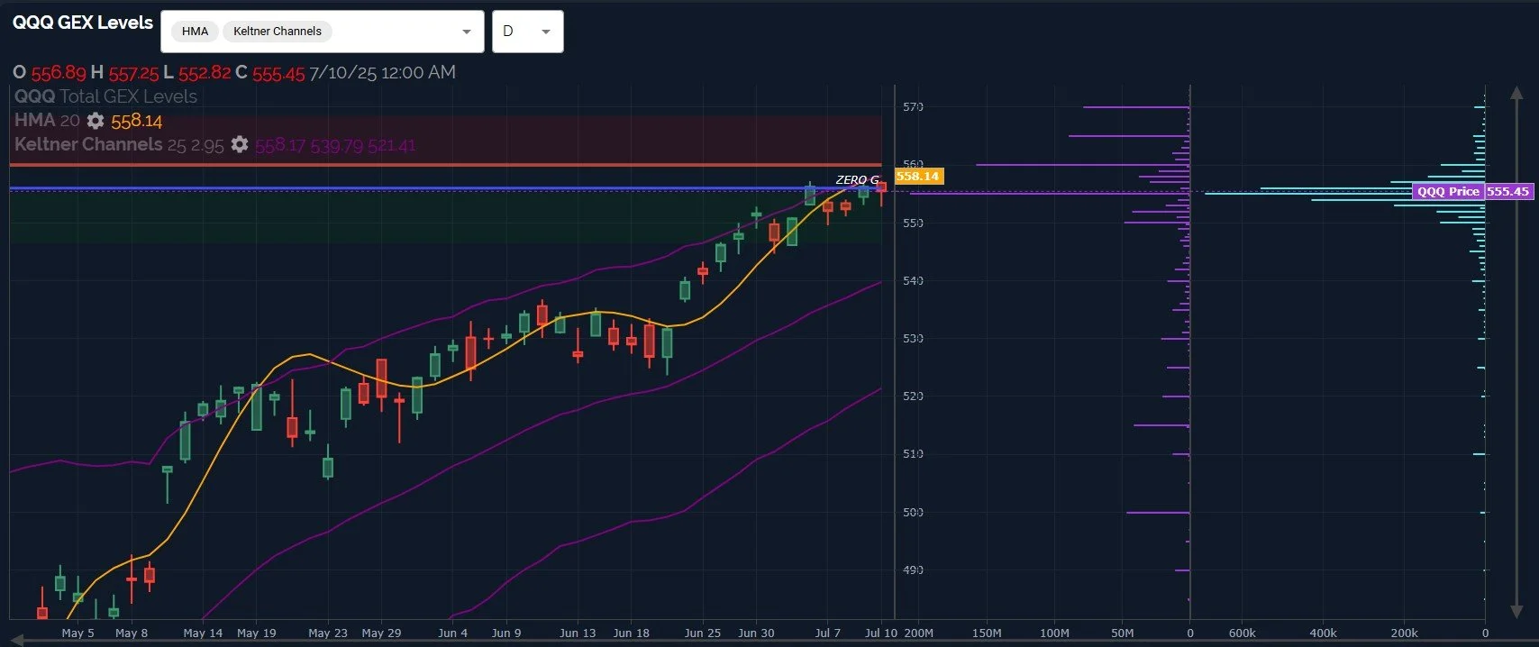QQQ and SPX have been flip-flopping, with SPX making a lower high yesterday as QQQ made a higher high, then today SPX made an incremental higher high while QQQ floundered. In the meantime, these “records” are all technicalities within a few pennies as red paint becomes more visible under the hood (don’t look at the software sector today, or everything but the Magnificent Seven yesterday). Weakness is present under the surface. QQQ’s GEX structure shows diminishing GEX clusters beyond 560, and we are still below the daily Hull. A break below the weekly Hull at 553 carries potential to see a more meaningful drop of 3-5% or slightly more.
