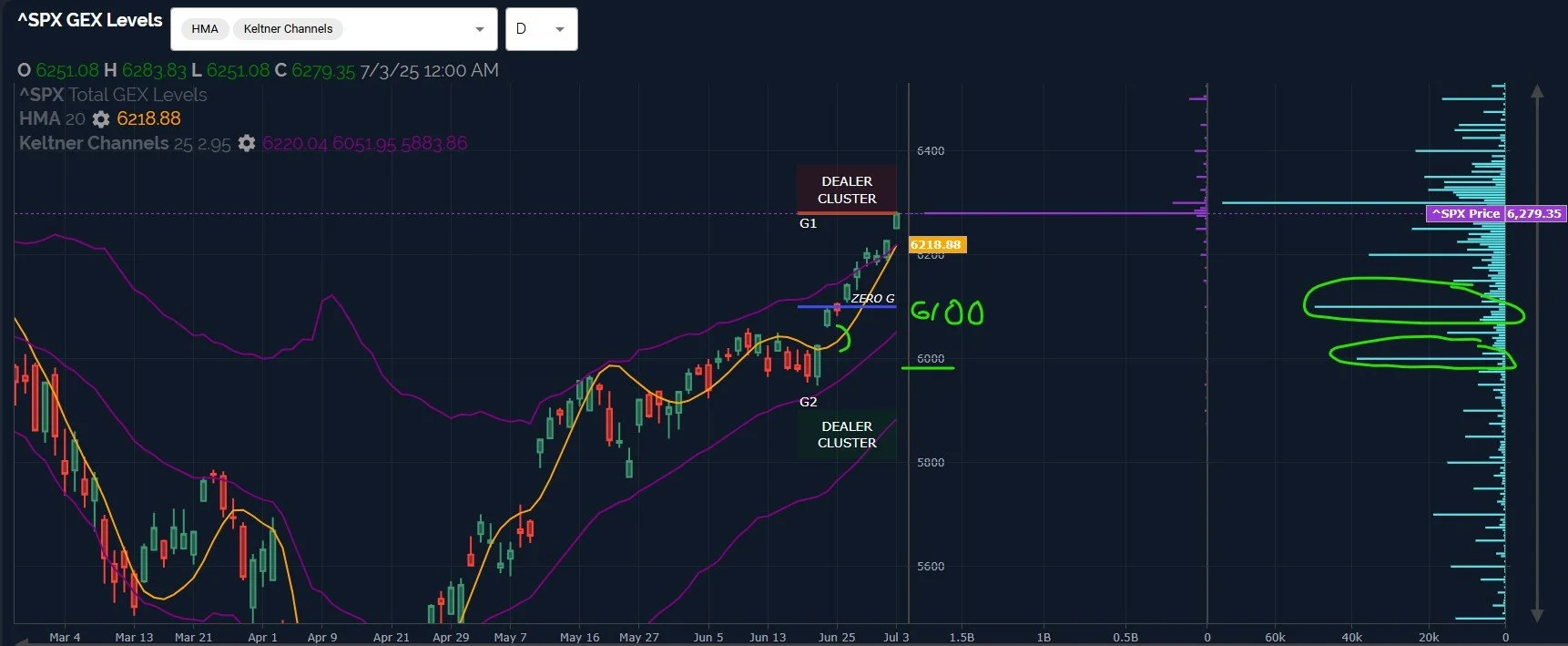 We’ll take a closer look at IWM and SPX in a second, but starting with a brief look at DIA, we see two obvious moves higher since April, with a mostly sideways consolidation in between. Price is extended above the upper Keltner channel, which is not very common, and especially not in a sustained fashion, with the yellow Hull Moving Average pointing almost straight up. We can see 2-3 examples just on the short timeframe visible, but when the Hull is pointing higher this sharply at the upper Keltner channel, that’s typically close to where we see markets reverse as price eventually crosses back under the Hull. The upper Dealer Cluster zone where we expect dealers to potentially become sellers resides at 450, just over head, and we saw high volume at lower strikes ranging from 392 to 420. Interestingly, DIA GEX topped June 30 and GEX is now below June 24 levels, meaning the same level as the day before the sharp rally took place that has led to this point.