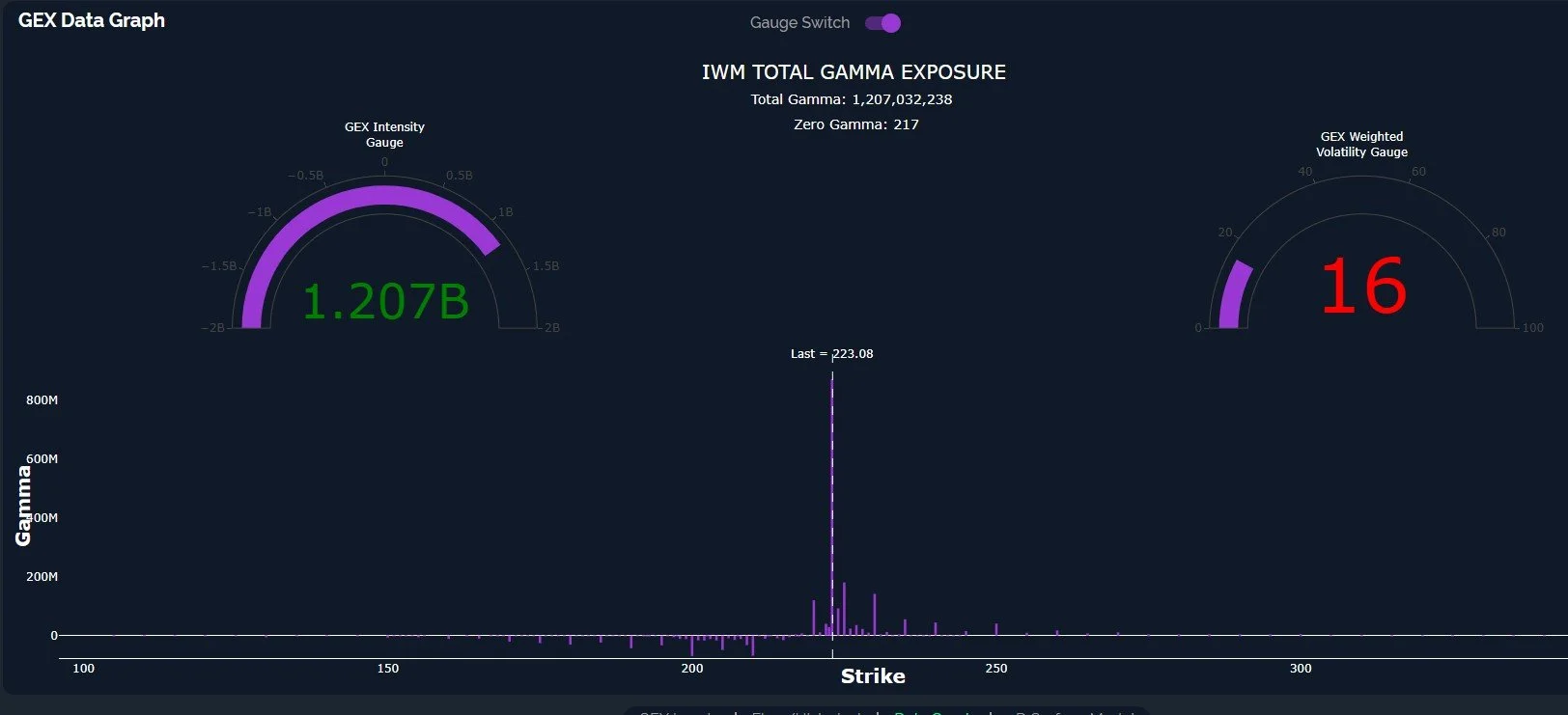 IWM has exceeded the upper Keltner channel, though not quite as extreme as we see with DIA, but we still see similar attributes in some respects: a sharply rising Hull, distance between the Hull at 218.24 and Thursday’s closing price at 223.08, and high volume at lower strikes (200 and 210/212 catch my attention). Particular to IWM is a sharp reversal in negative GEX to positive after the bulk of the recent move has already occurred.