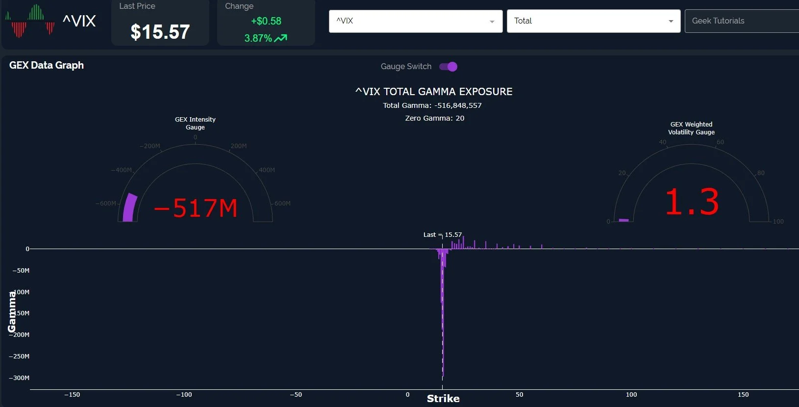 VIX gamma exposure (GEX) remains close to extremes, with a lot of negative GEX at 16. The negative GEX has shifted higher from the 15 strike in recent days, which is interesting.