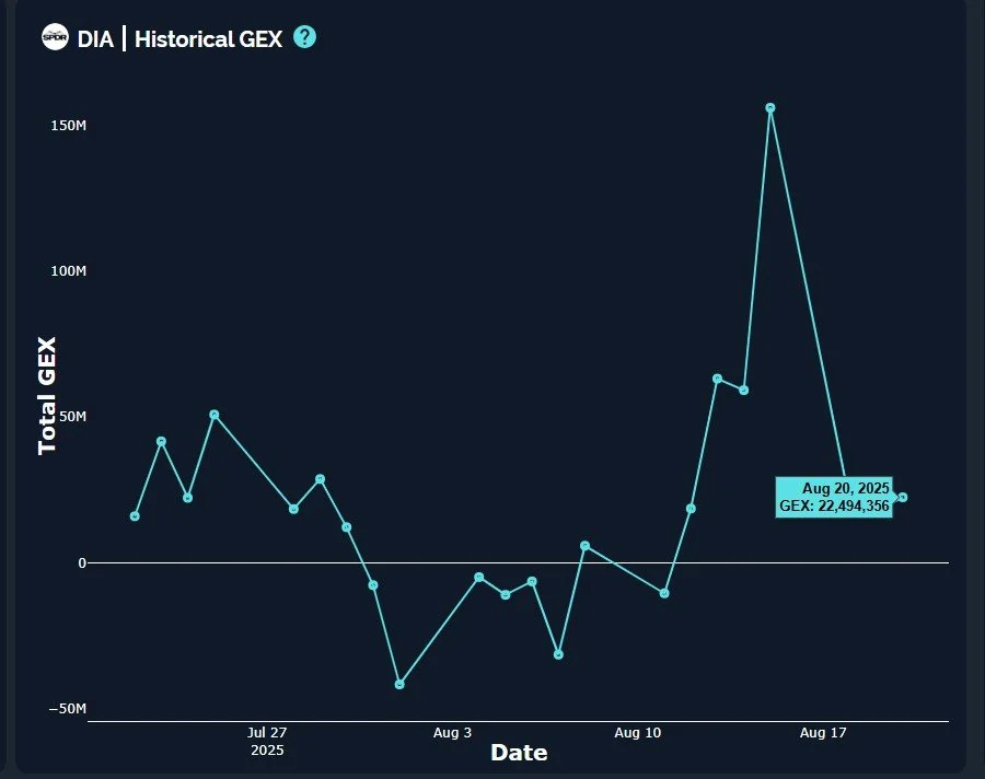 DIA still holds above both the Hull Moving Average and the 9-period SMA, and the positive GEX picture includes noteworthy targets at 450 and possibly 460.