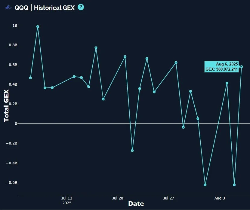 QQQ with roughly a 1.2B GEX swing, going from -623 million GEX to positive 580 million.