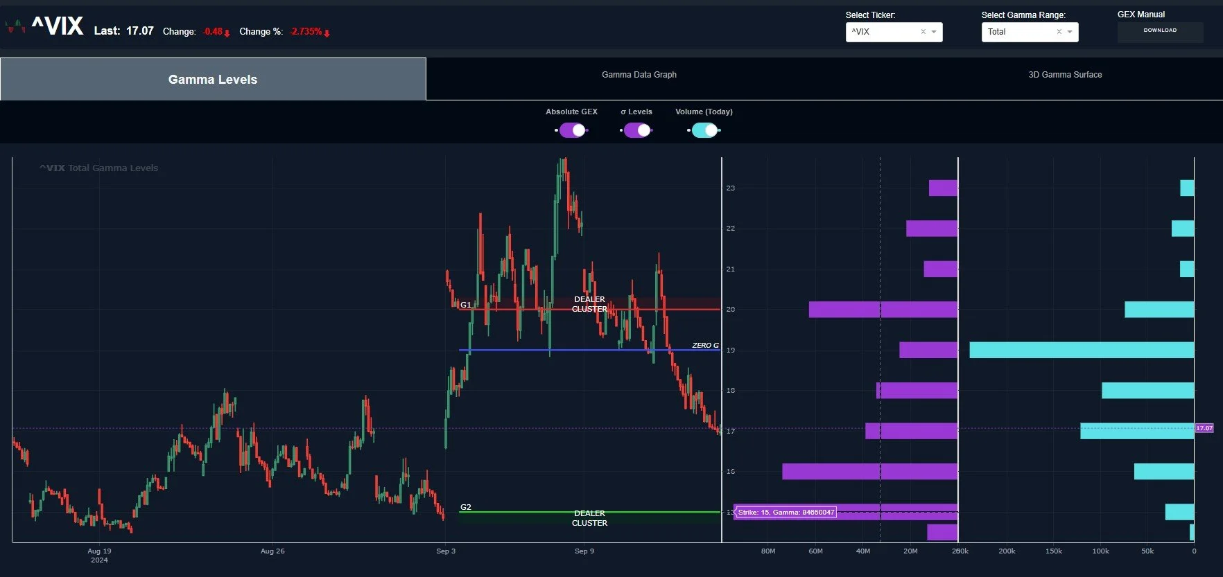 I’m glad you asked. Yesterday, we discussed VIX expiration coming up this Wednesday. Well, the options market shifted somewhat, with the lower Dealer Cluster Zone shifting to 15 (a big negative cluster also exists at 16). However, the positive cluster overhead at 20 remains. Also note the light blue volume on the chart below, showing that a lot of trading occurred at the 19 strike, despite the less meaningful GEX at that area.