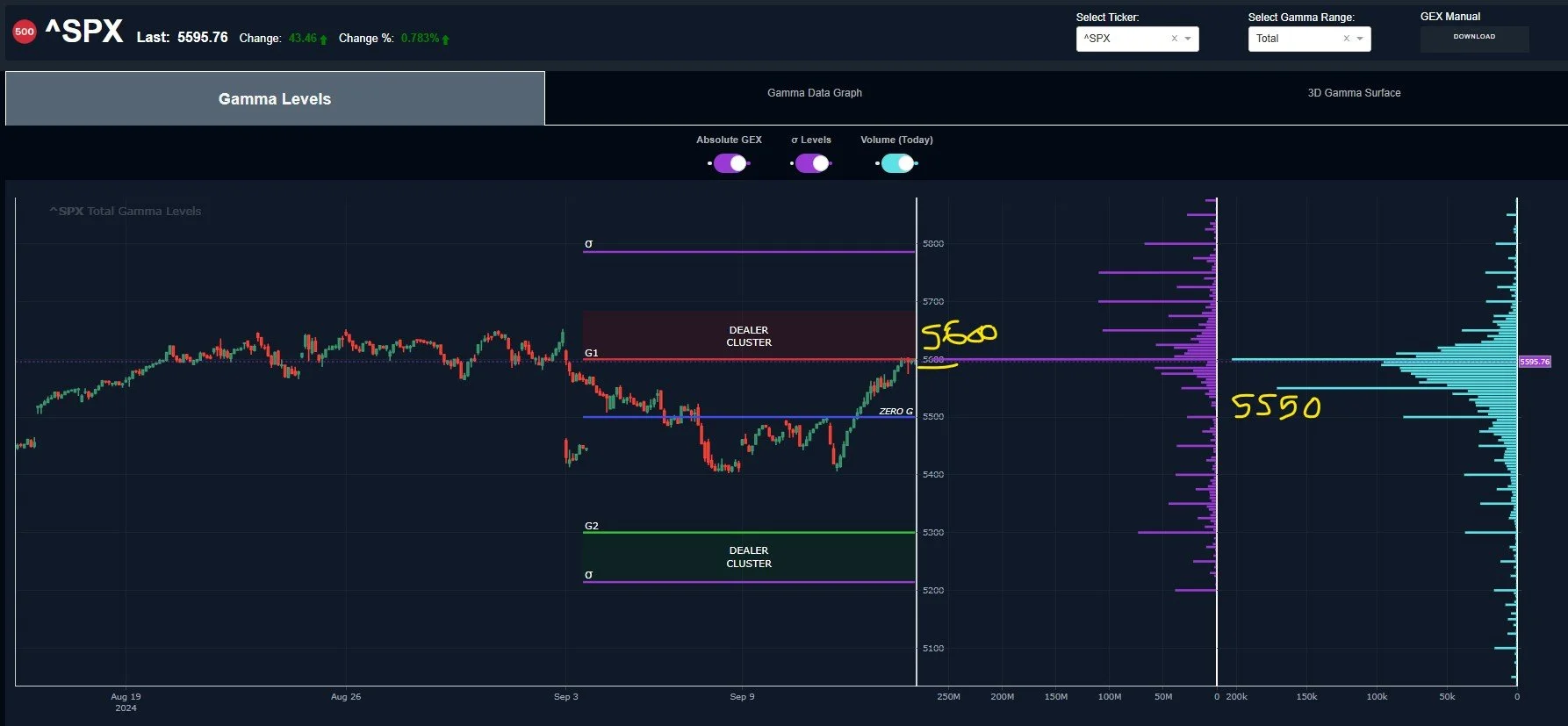 Early weakness today was not really reflected in the GEX profile, in fact, mid-morning we posted in Discord that 5575-85 SPX appeared to be in focus, a 30-point differential from the 5554 level at the time of posting. Once again, our gamma (GEX) tools gave us additional insight that proved profitable as markets embarked upon a post-European close rally to over 5600 SPX.