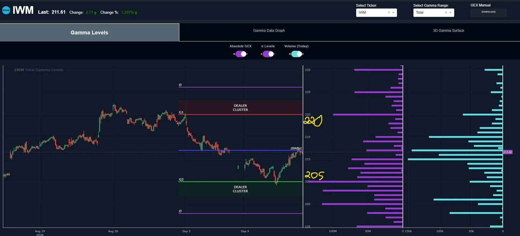 If IWM sees a pullback from here, 205 is where we might see some support, though we don’t necessarily require that in order to attempt those higher levels close to 220+. We saw a perfect tag and rebound off of our 205 GEX Dealer Cluster Zone prior to this move higher.