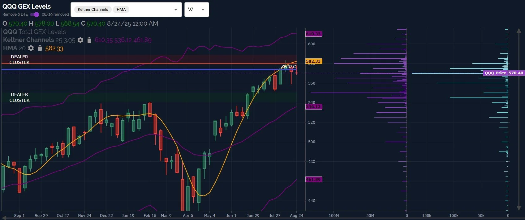 For a different perspective, let’s zoom out to the weekly chart, noting the failure just below the weekly Hull at 582.33 and the large GEX cluster at 550.