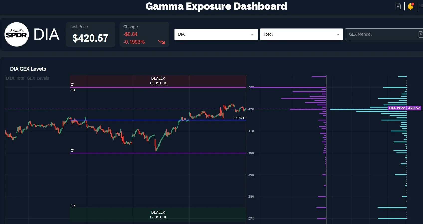 Perhaps a telling hint, DIA GEX actually shifted more positively, with the upper dealer cluster zone actually reflecting 430 as a target now.