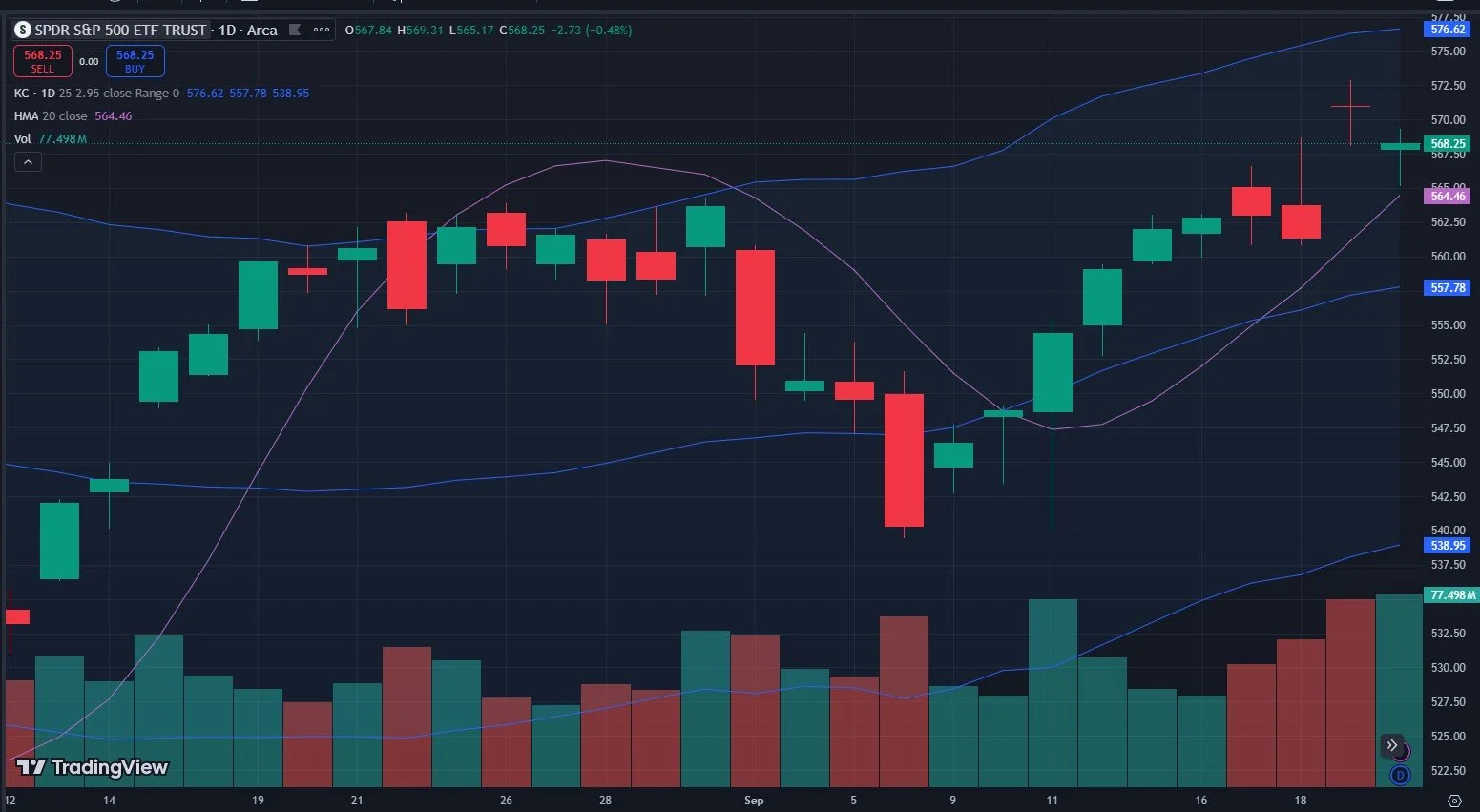 We still see SPY holding the Hull Moving Average despite the narrow candles typical of a top, so perhaps we may see an attempt to reach a higher high one more time. The Keltner channels (lower band at roughly 539, upper band at 577) match with the GEX levels we’re watching between 575-580 for SPY on the upper limit. Click here to watch a video posted this evening where we address SPY, QQQ, SMH, GLD, TSLA, and more.