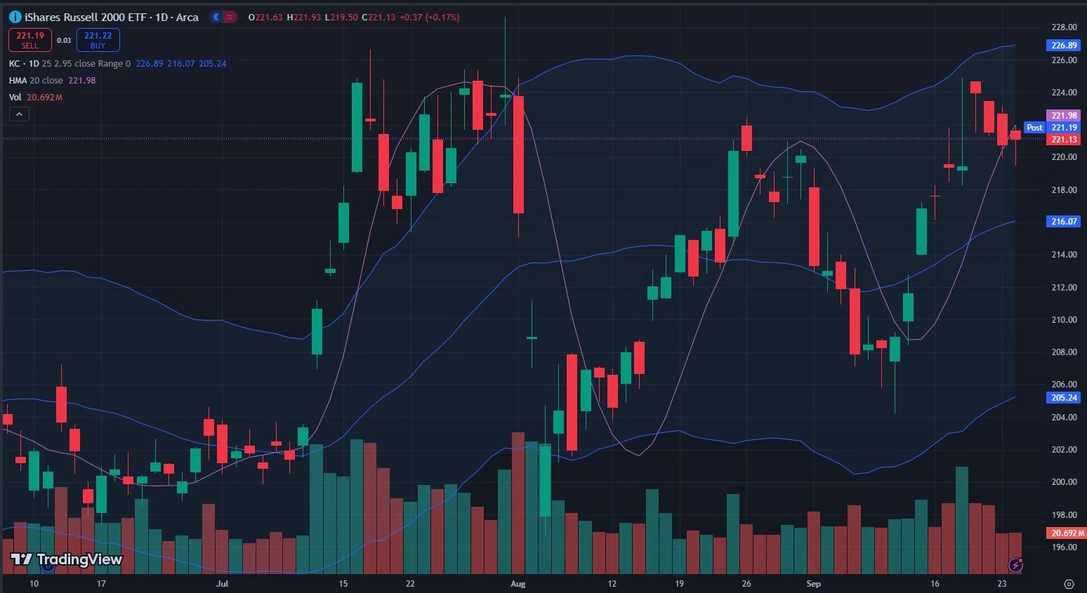 Backing the view of a topping process, SPX is hovering just below the red Dealer Cluster Zone. We see a large GEX cluster at 5800 (though not as large as the 5750 cluster), which is very close to the upper Keltner at 5776, so based on those two indicators, a push higher has a fairly good probability of happening, even if only briefly. As a reminder, seasonality in election years means we might see a nice drop into late October, however.