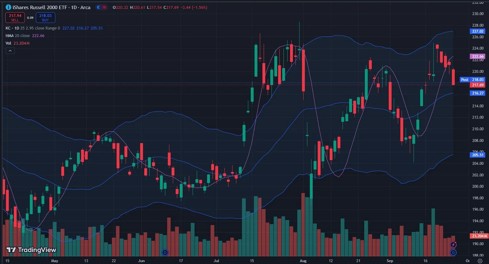 We revisited IWM yesterday, and thus we were punished today with a big red candle in IWM. That said, one man’s punishment is another man’s shopping spree, and buyers may start to look more closely IF the rest of the market is looking higher over the next few days. IWM Is almost to the $216 middle Keltner channel, and we can draw a trendline back to the August low that hypothetically implies SOME sort of bounce in this general area.