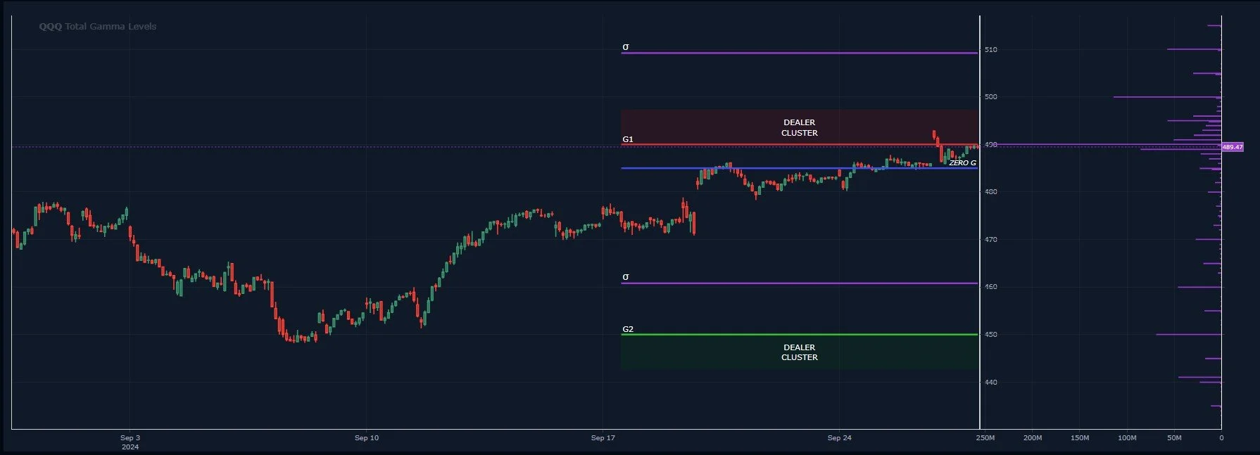 Both QQQ and SPX are in the red dealer cluster zones, which is where we expect consolidation and possibly a larger selloff, though we can’t speculate exactly how it will play out based strictly on this GEX picture.
