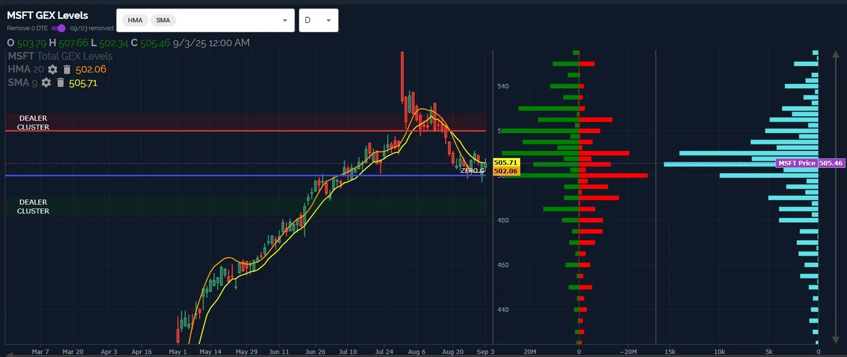 Lastly, MSFT may be another name to consider, with the Hull+9 SMA already turning up, and 520 giving us a large GEX cluster to watch overhead.