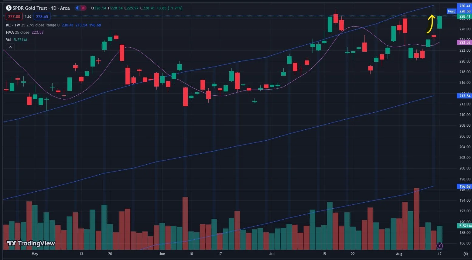 Thursday evening, we brought up GLD as a potential opportunity based on what GEX was telling us, and sure enough, after teasing both sides Friday (but with a gap up), we saw a nice rally today, almost reaching 229 and closing at highs. We were looking for 230-235 and we are almost there. With the Keltner channels in a solid uptrend, and room overhead, we can certainly move higher from here, but I wouldn’t have any interest in opening new positions personally, and managing risk becomes paramount, especially with GLD..Just look at the last few times we had big green candles.