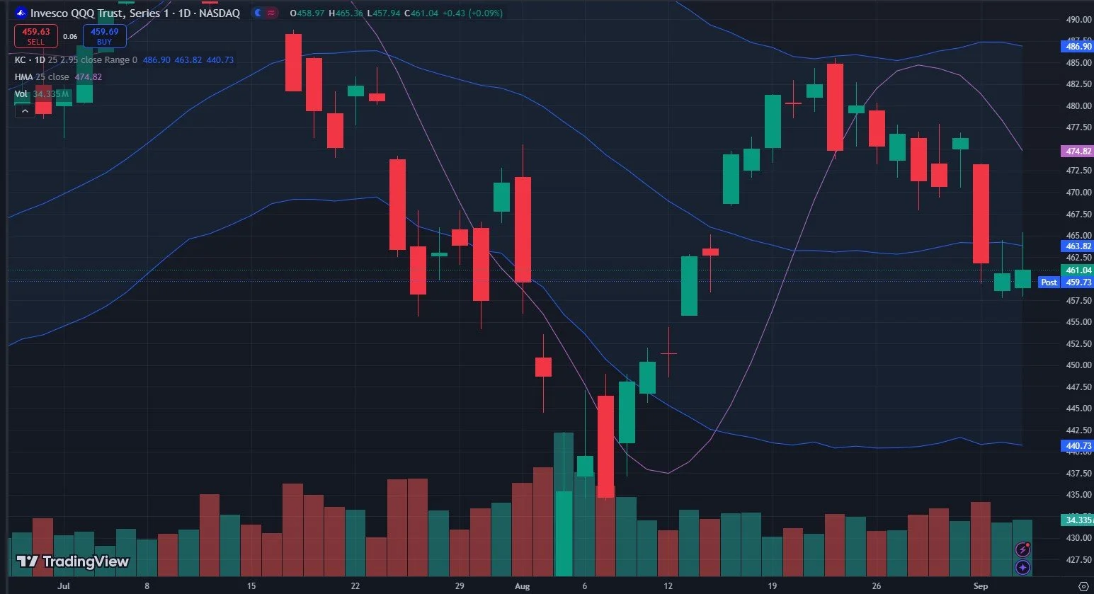 Oh great, here we go. I just HAD to keep looking around instead of sticking to a bias. Changing my Keltner settings to weekly, but the chart itself still reflecting daily candles, I see QQQ is still holding the middle Keltner channel, similar to SPX on the daily as shown previously.
