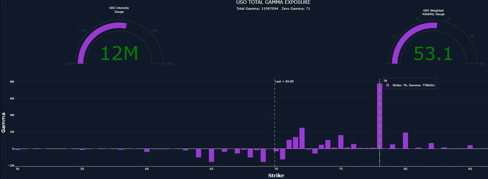 Interestingly, it appears that we are flirting with the launchpad zone where we saw price rally in June, and (as shown below) USO has positive GEX with a big strike at 78 concentrated on September 20. Could we potentially see a 10%+ relief rally for oil? With positive GEX (though close to zero) and a very large GEX cluster at 78, I’ll definitely be refilling my tank sooner than later.
