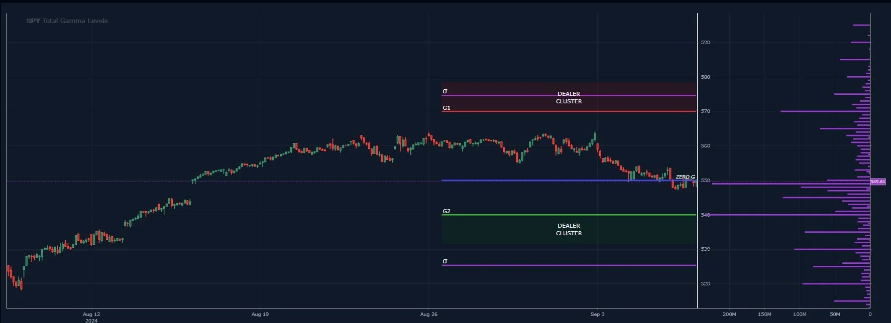 One point scored for the bears today: Gamma (GEX) barely changed, remaining at -553M, and SPY GEX was even worse at -1.69B. Technically, we consider +1B or -1B to be the boundaries for strong positive or negative GEX environments, so we have two different readings on SPY versus SPX.