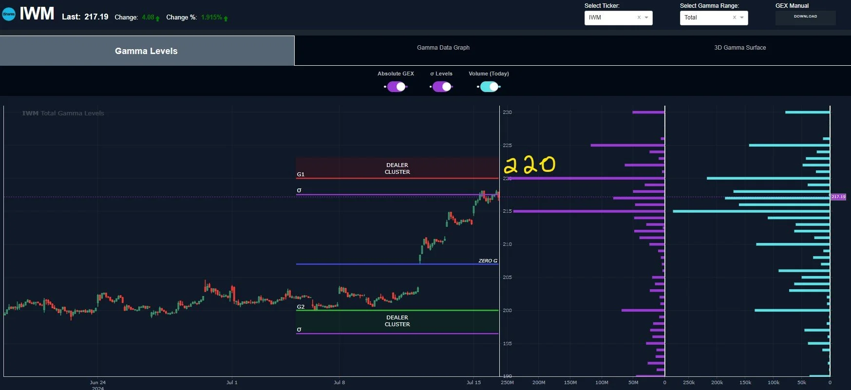 IWM may be headed for 220 before it heads south, so keep an eye on this. Based on the chart above and the GEX levels, IWM Seems to be very overbought though, so a fairly immediate selloff can and should ensue