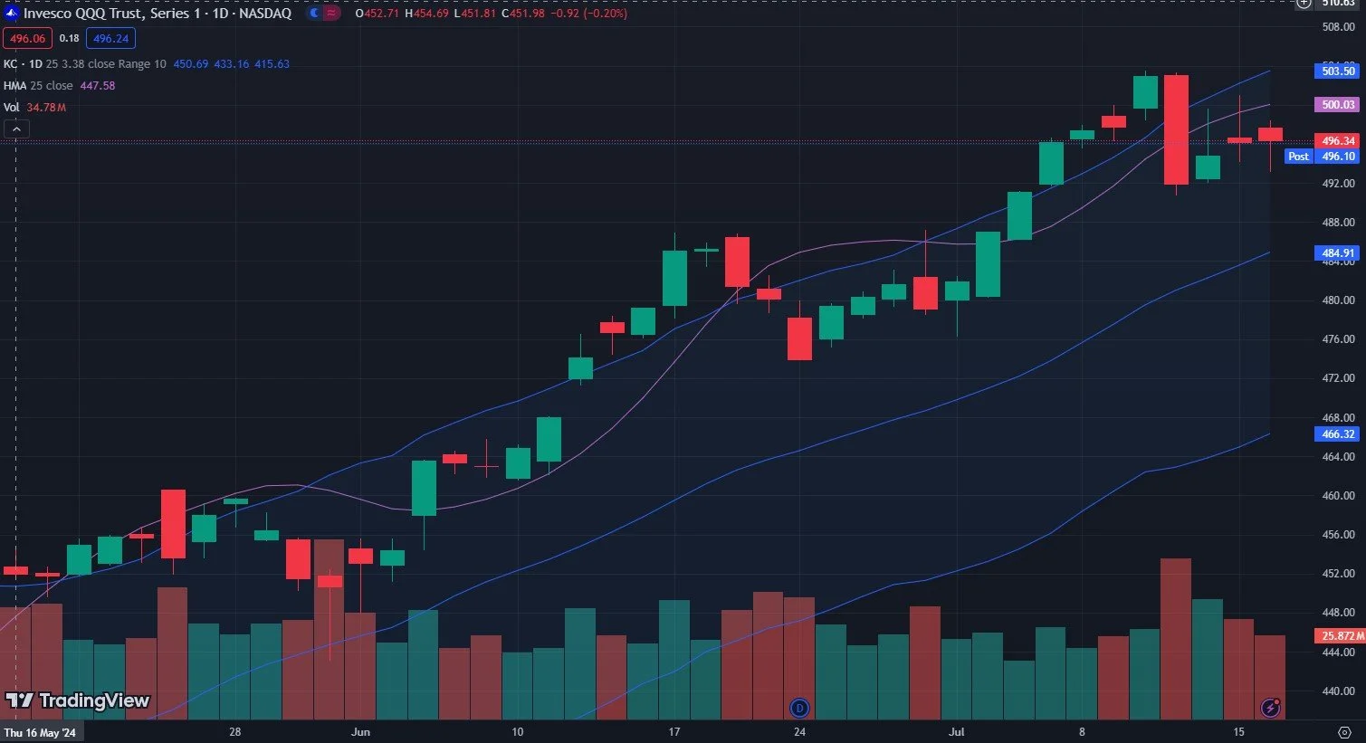 QQQ looks less bullish to me, with failure to exceed or even reach the Hull Moving Average today.