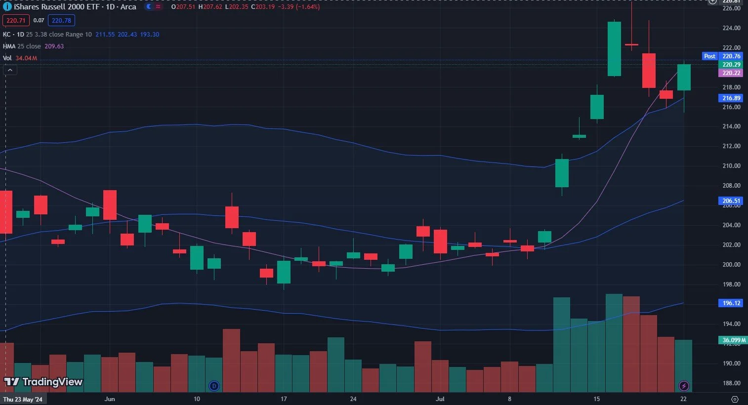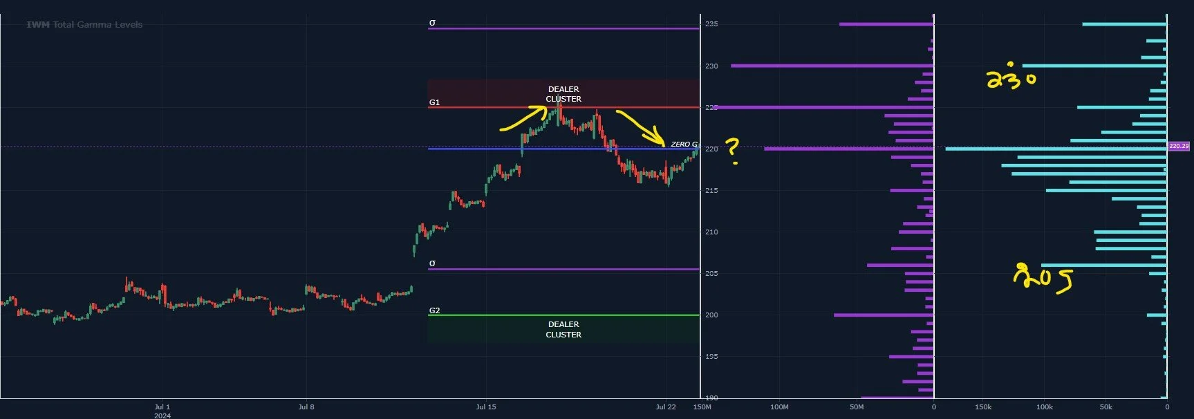 IWM tested the red Dealer Cluster Zone and also went quite far above the upper Keltner channel, then started declining. Is this rebound going to see 225-230 again or do we head south to 205-206 first?