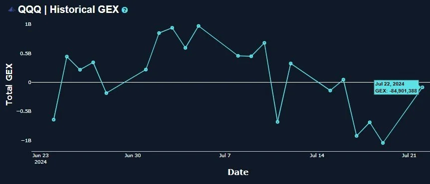 Gamma (GEX) also rebounded today, considerably from the -1B we saw after Friday’s close, but it’s still technically negative, within the range we consider neutral, though. Will we see GEX swing back to marginally positive territory, which has characterized QQQ during much of the rally since April, or will we dive back into deep negative territory and begin a more sizable correction?