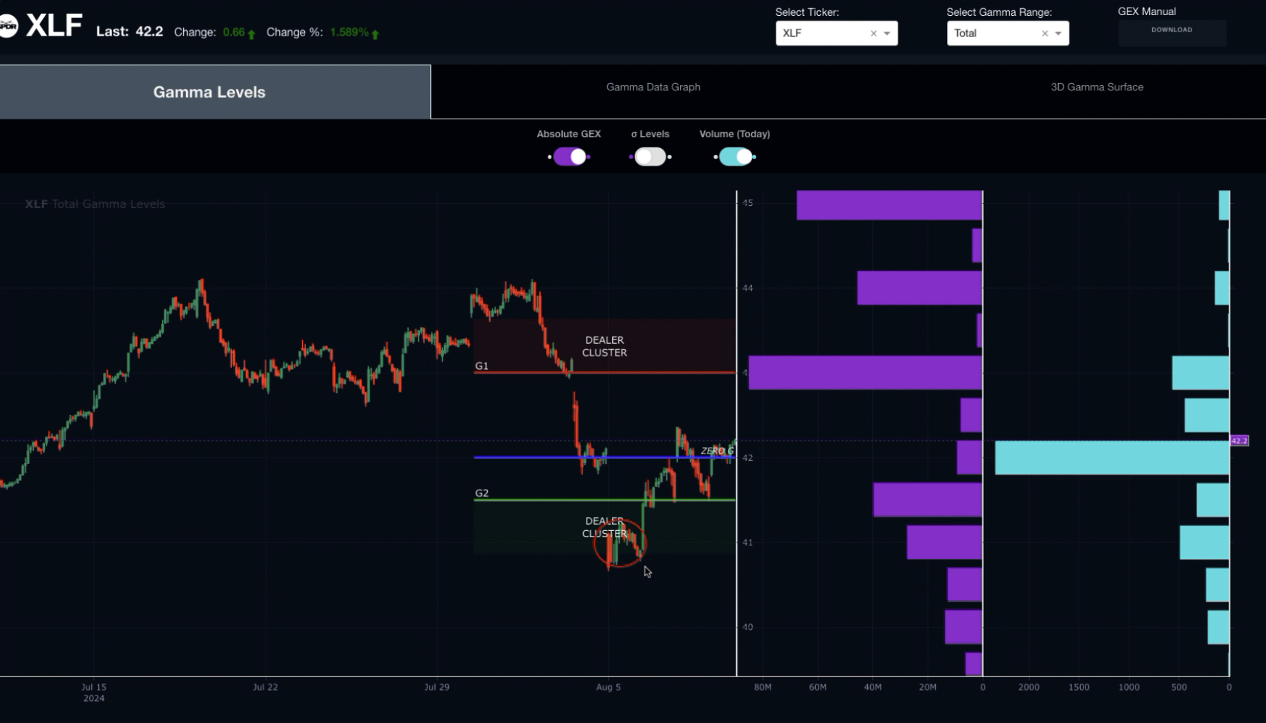 The financials have been a relative outperforming sector in the past month and the GEX structure on XLF shows that market participants appear to be focusing on the 43-45 strikes (purple bars).