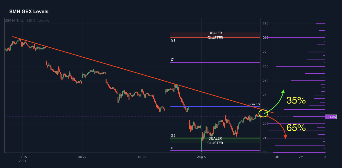 The SMH(semi-conductor ETF) appears to be reaching an important area both from a GEX perspective (near Zero GEX) and from a technical perspective as it approaches the down trend line.
