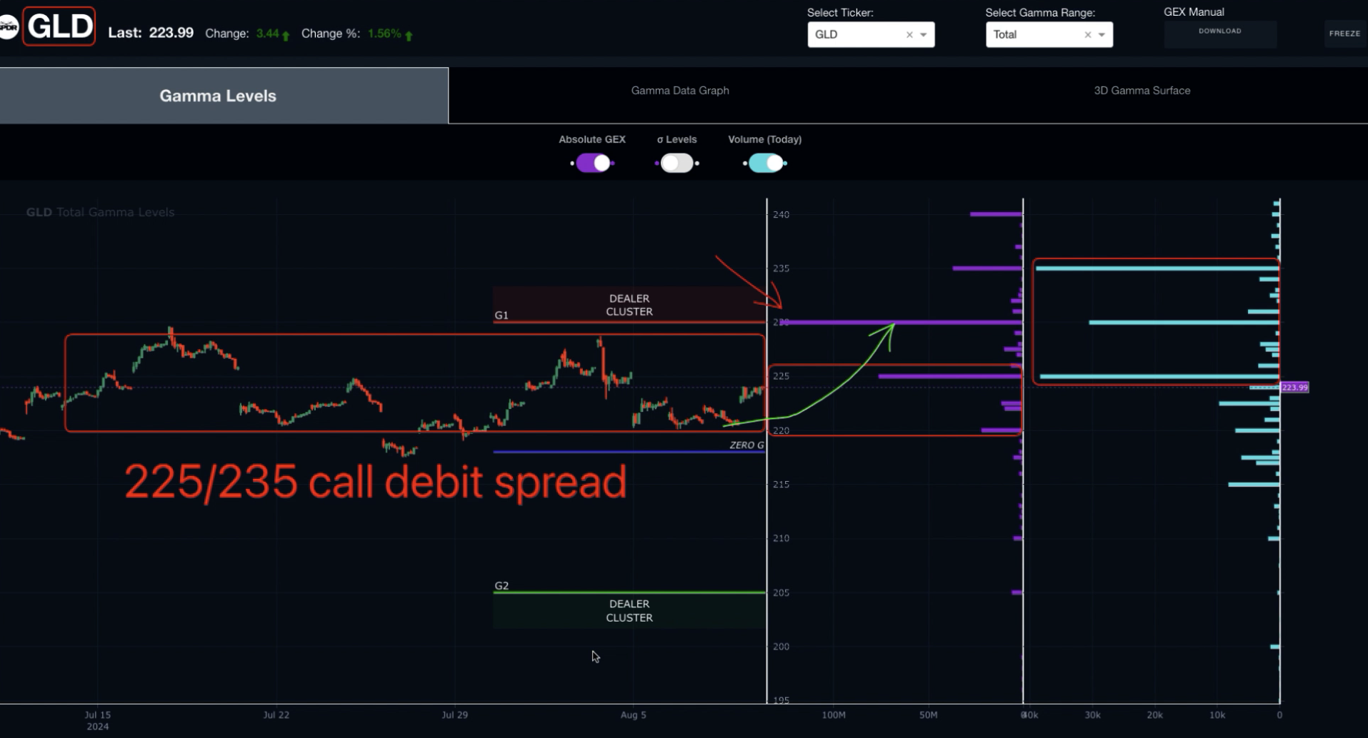 Recently, the largest GEX concentration has been at the 230 strike and we think there is a decent probability that GLD can make a move towards that level in the coming weeks, especially given market and geopolitical uncertainties rising.
