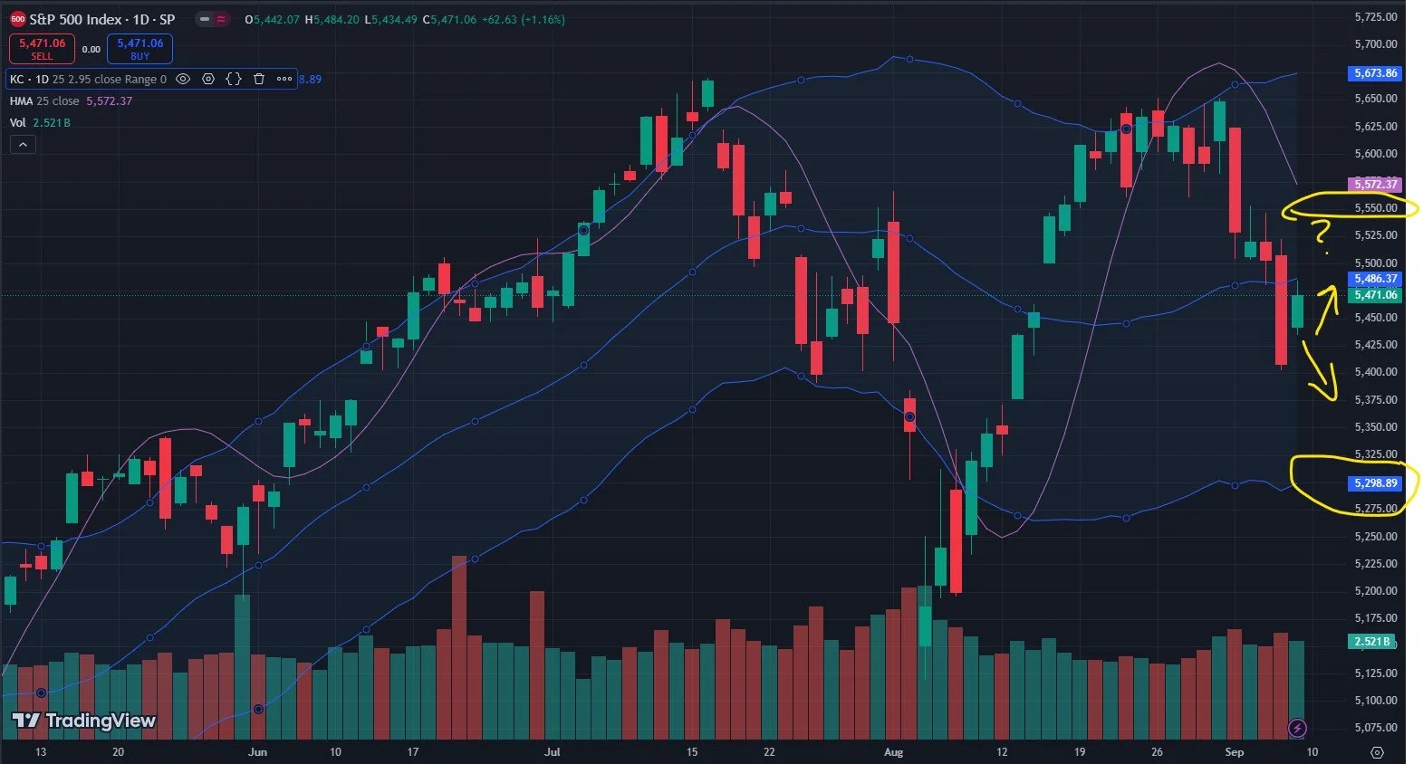 Looking more closely at the chart, the Keltner channels signal SPX has a path of least resistance down to 5299, since we’re below the middle Keltner channel. C{I Wednesday and Friday the 13th (for the superstitious traders out there) might be arguments for lower prices. However, we have 9/11, an overwhelmingly bullish market day on the anniversary of 9/11/2001, and we have generally oversold conditions.